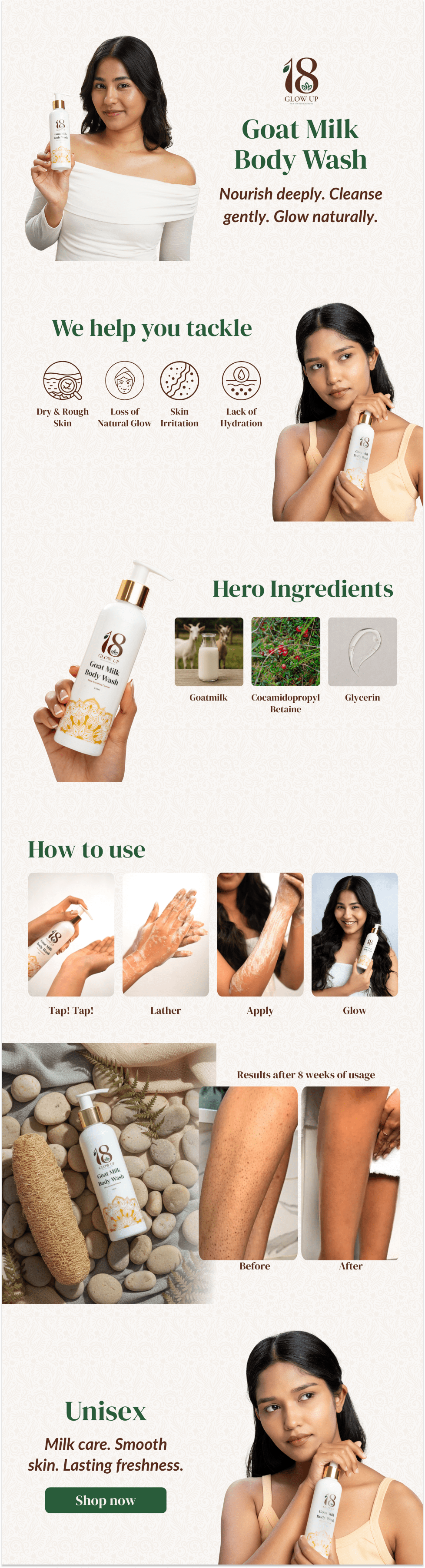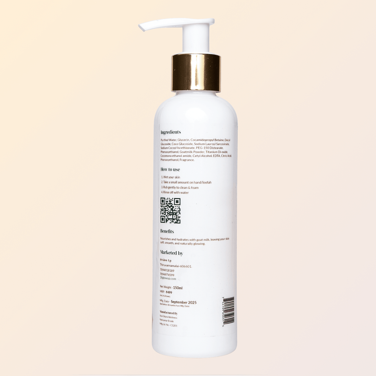 Our Goat Milk Body Wash is rich in natural milk proteins and glycerin, which deeply nourish your skin every time you shower. It gently removes dust and sweat while keeping your body soft, smooth, and glowing all day - no dryness, no irritation.