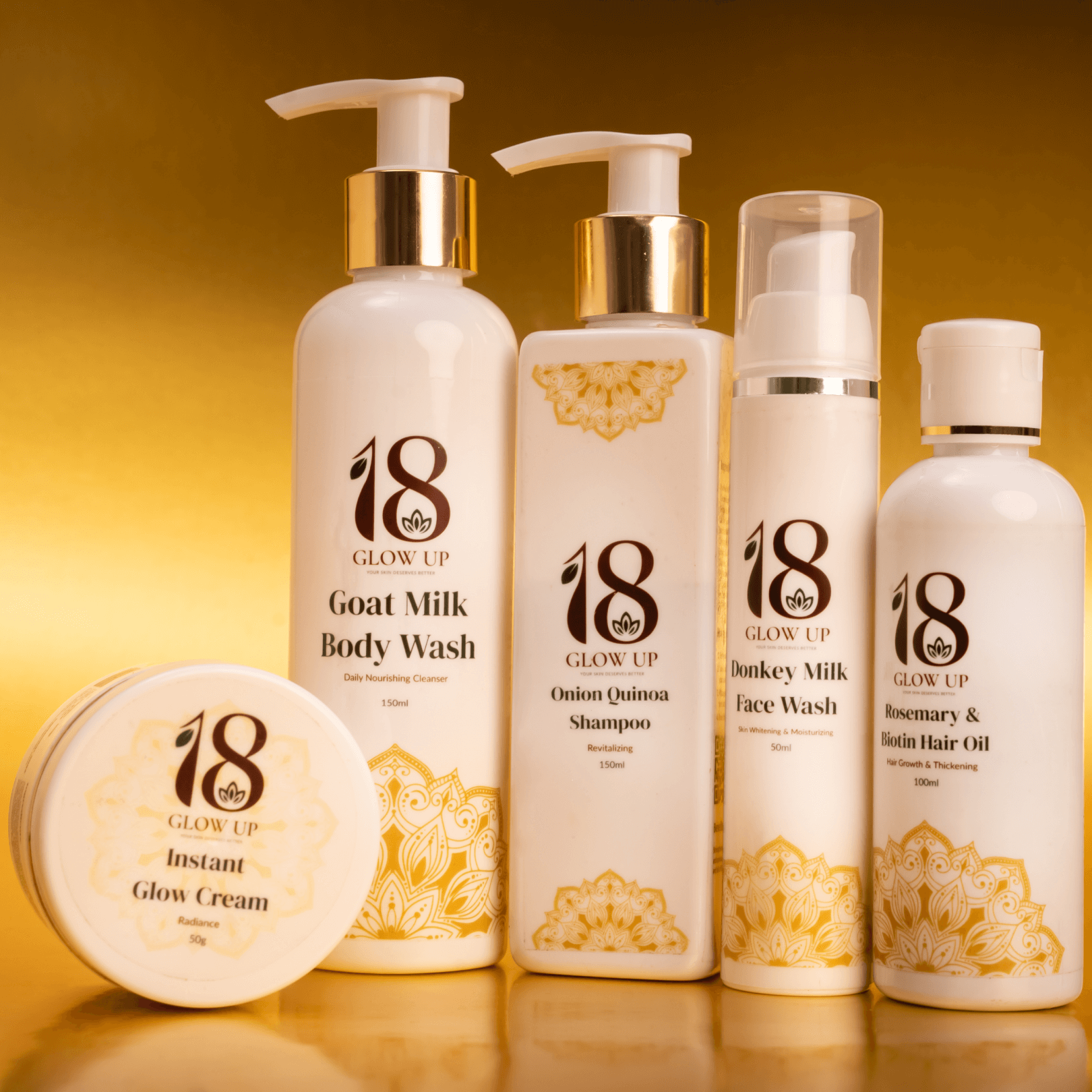 The Ultimate Combo brings together all 18Glowup essentials, Donkey Milk Face Wash, Goat Milk Body Wash, Instant Glow Cream, Rosemary Hair Oil, and Onion Quinoa Shampoo. It’s your complete self-care ritual, designed to nourish your skin, strengthen your hair, and boost your natural glow from head to toe.